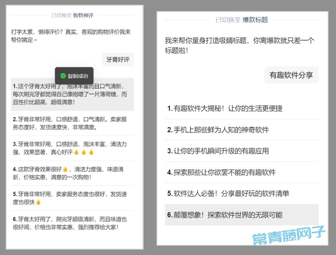 还有一些是需要筛选的,像是各种好评模板和取标题等等,它也能生成很多个可供挑选,点击就能复制。