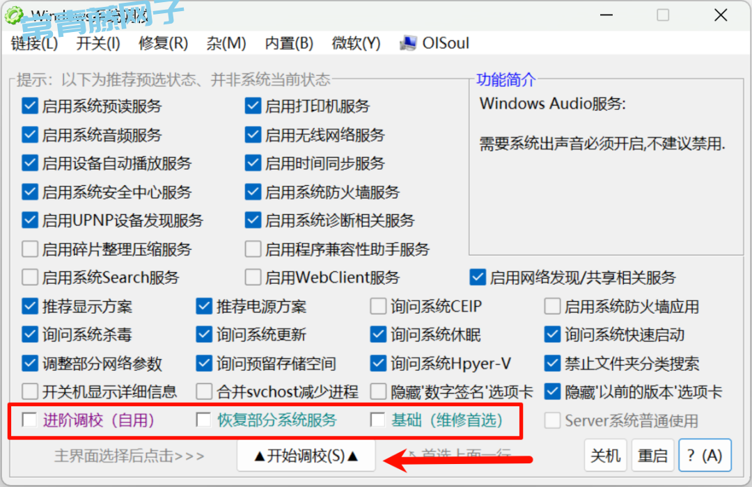 当然,如果你懒得调那么多细节,一个个挨着去找的话,可以使用作者配好的一键优化,勾选自己想要的模式,点击下面的开始调教。稍等一会儿就会全部优化好了