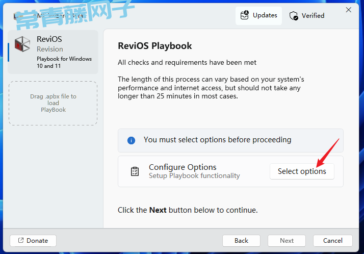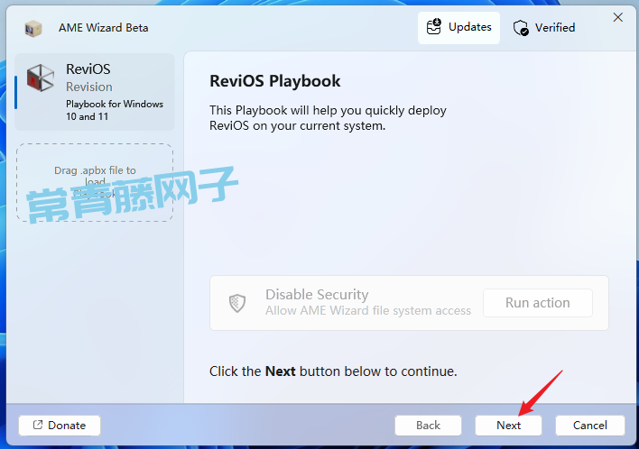 下面来具体看一下操作界面,将配置文件(本文选择的是Revi-PB-25.10.apbx,适用于Win10/11,官方称之为ReviOS)拖放到主页面后,首先需要点击“Run action”,这一步的目的是为了关闭杀毒软件,只有关闭后才可以点击Next,否则按钮是灰色的,无法进行下一步。按照给出的提示操作即可。