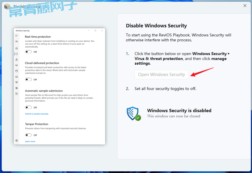 点击“Open Windows Security”即打开安全中心,把里面的四个按钮都关闭,如下图左侧所示。安全中心关闭后,该窗口就可以关掉了。