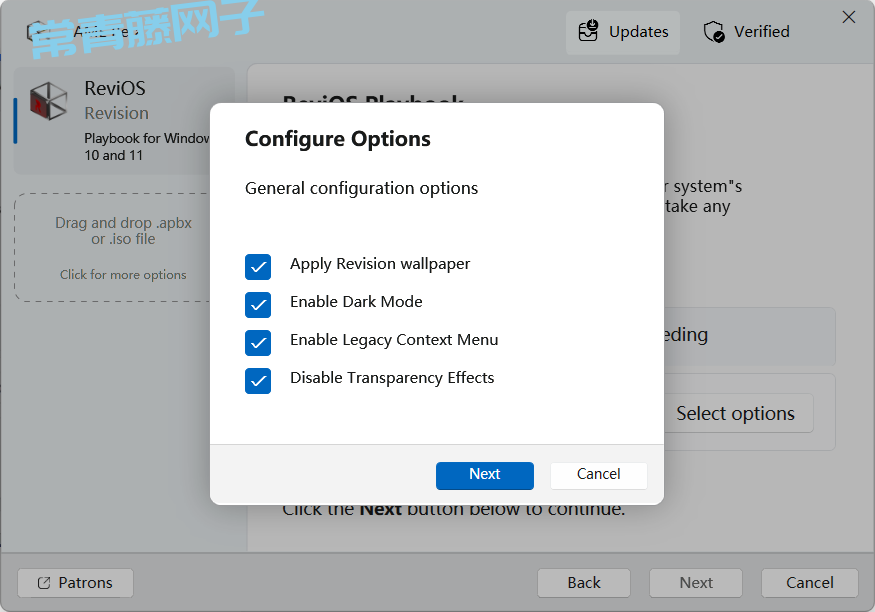 应用修订过的壁纸(软件自带的),启用深色模式,启用旧版的右键菜单、禁用透明效果。如果不喜欢这些默认的设置,可以取消勾选。