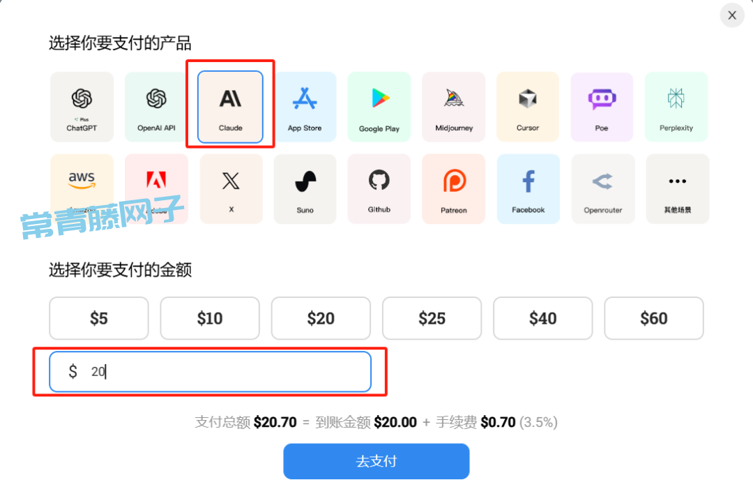 ※ Claude Pro 的每月订阅金额是 20美元,因此我们在充值到账金额这里,输入【20】。