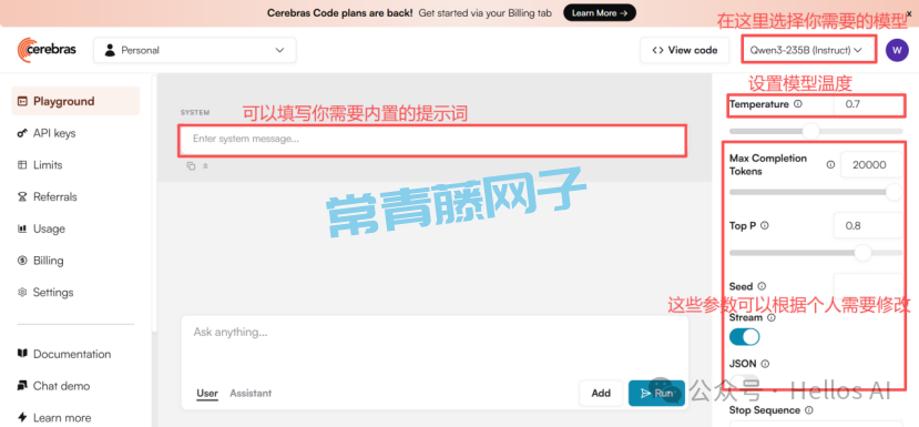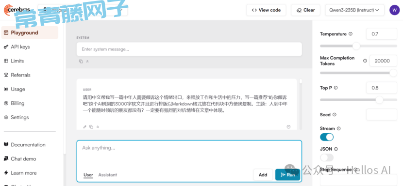 Cerebras 这个AI算力平台终于藏不住了!实测每秒输出478token,免费用!