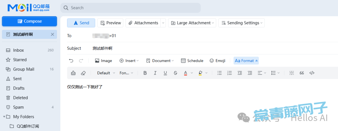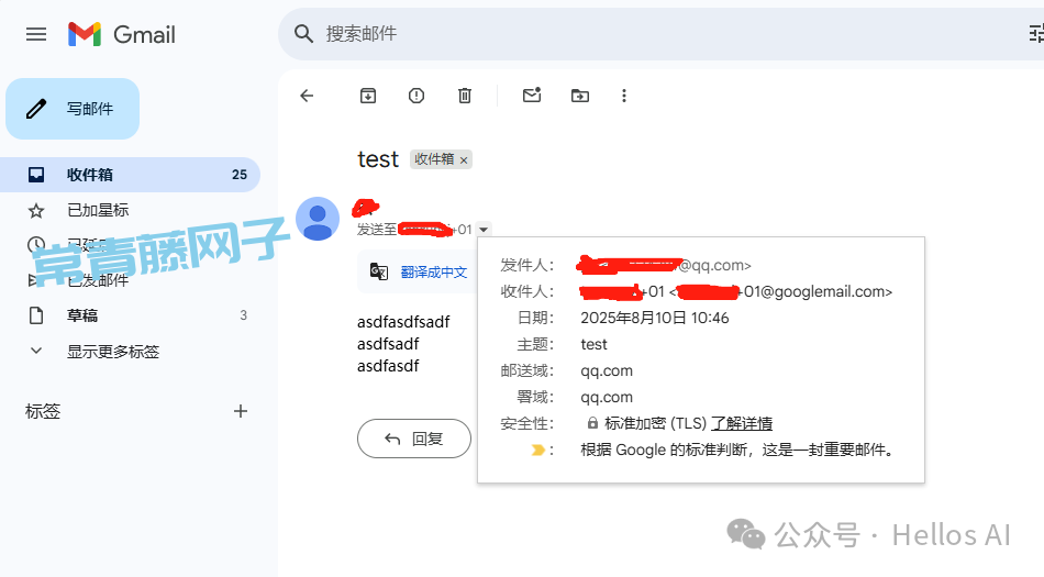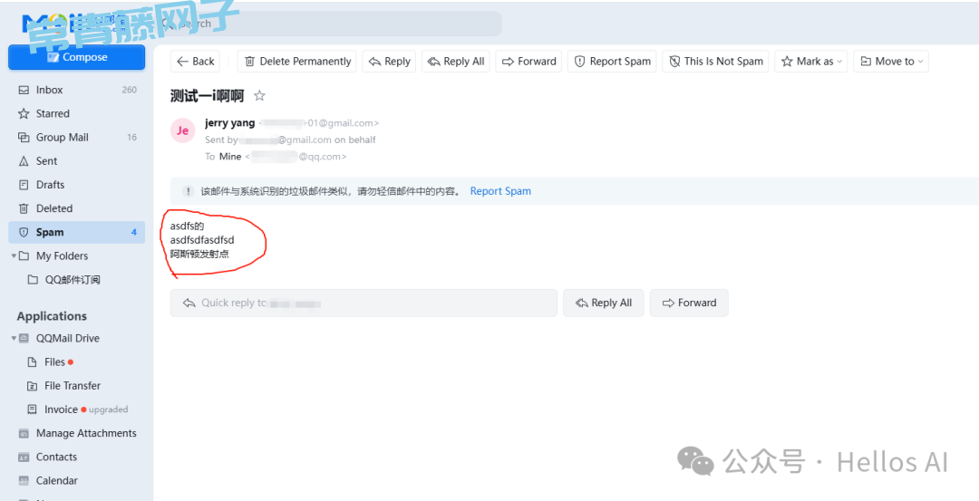 注:这里qq邮箱把我这个使用别名发送邮件的邮件当作垃圾邮件了,像这种别名邮箱建议是用来收邮件最好啦!