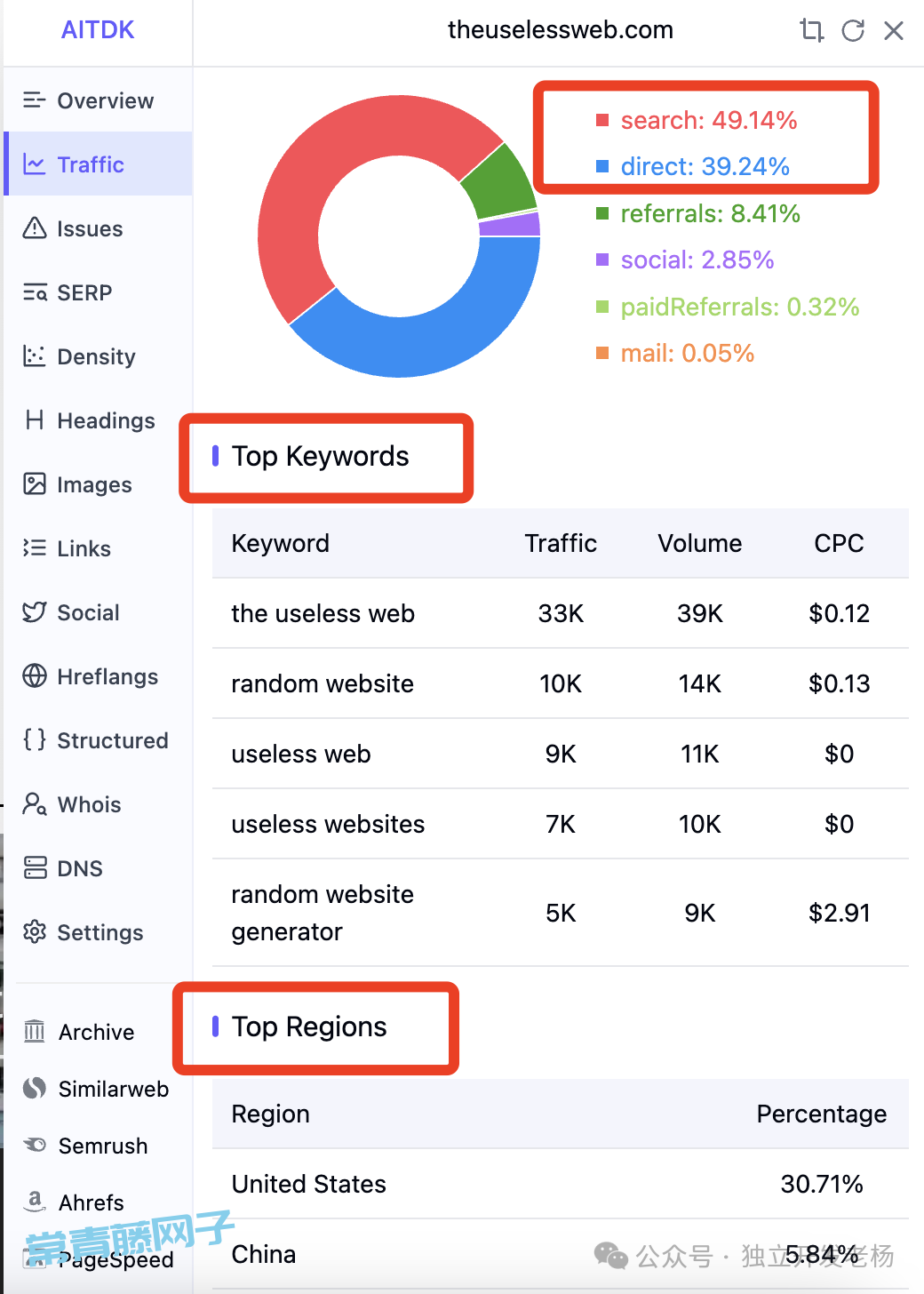 网站最大流量来自搜索引擎搜索(49.14%),其次是直接访问(39.24%),另外还有部分来自外链(包含付费外链)、社交媒体和邮件的流量。主要搜索词是useless/random website(s)。访问国家集中在美国,比较意外的是来自中国的访问量排名第二。