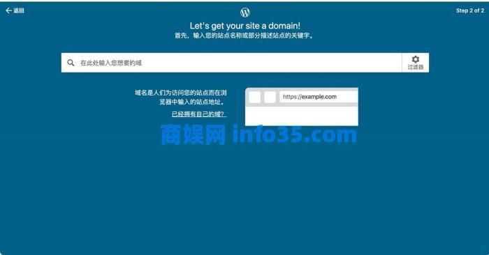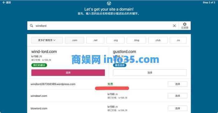 建立WordPress账号以后,跳转到的是域名界面。这个区域可以使用自己已经拥有的域名,也可以买一个全新的域名,不过为了将免费进行到底,我不打算在域名上花钱,就随便想了个名字。以后要是想要有个好域名,也可以随时添加或更改。