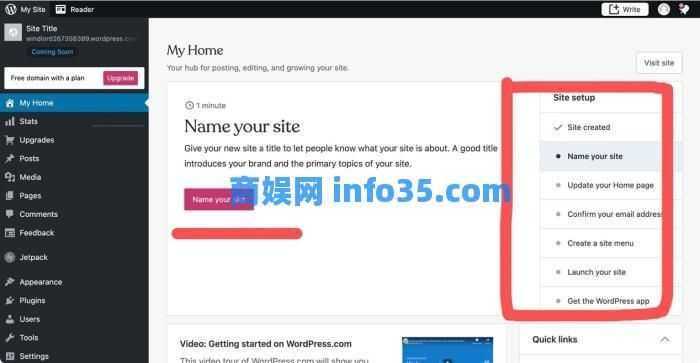 选定了域名,自然就开始了正式的建站之旅。网页将跳转并自动进入到建设网站的后台。其中“Name your site”这个紫红色按键就是进入下一步的关键入口,随后的步骤,就如右边被我用红色线条框起来的差不多。
