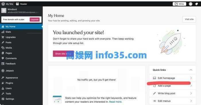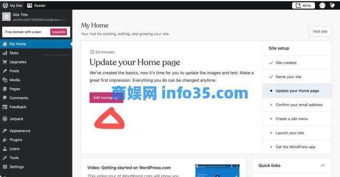从菜单编辑的地方退出来是比较麻烦的,我一直没找到比较合适的返回键。私以为,这个交互有点麻烦。我通常是把顶上的地址栏删得只剩下Wordpress.com,就会回到自己的后台。继续选择主页编辑。