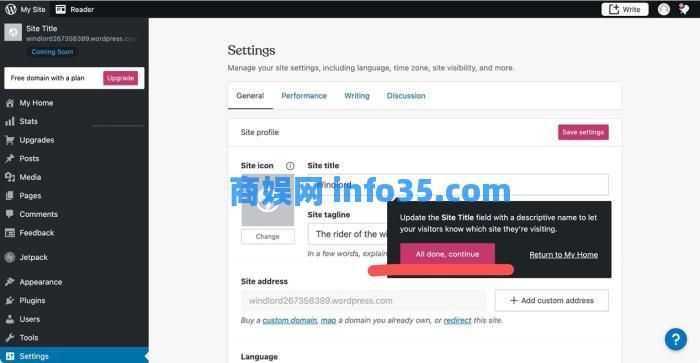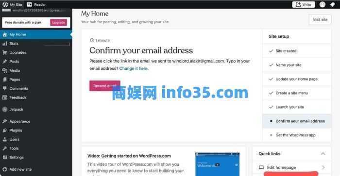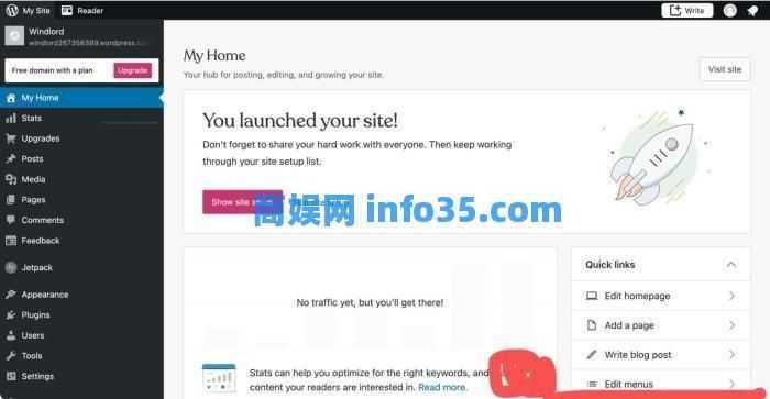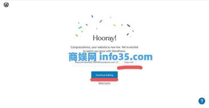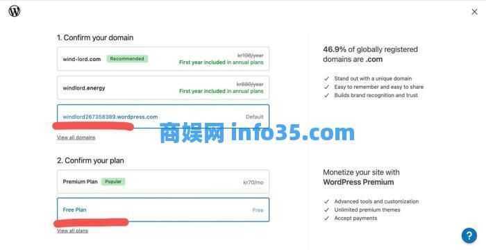 点击发布按钮后,WordPress看起来还是想要再努力一把,于是又出现了诱拐买域名或者定制会员的行为。不过我还是相当坚定地选择了免费版。