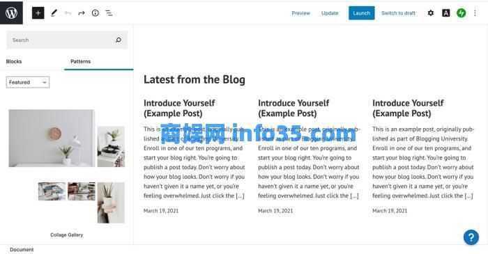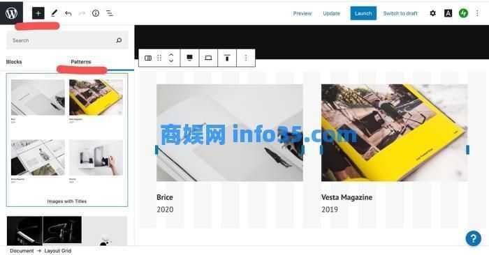 我随意看了下,认为最起码还是要加些相册或者合辑,于是我从页面左上角的“+”号处,添加内容。这个按键进去后有很多内容可以选择,其中,“Blocks”是一些固定模块,比如段落,比如题目,这个操作跟做PPT有异曲同工之妙。但我选择的是右边的“Patterns”,里面有很多已经搭配好的内容,我选了一个带四幅封面图的相册。