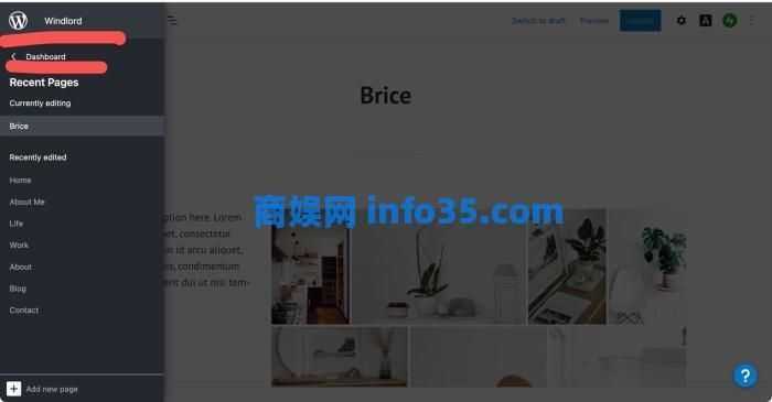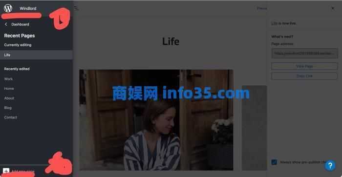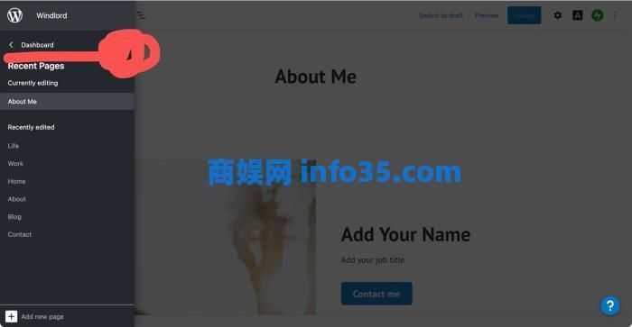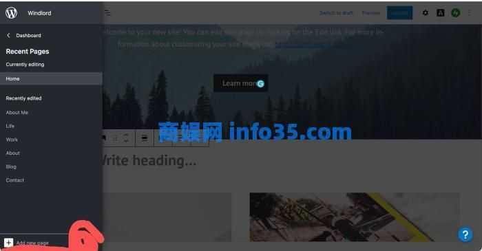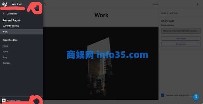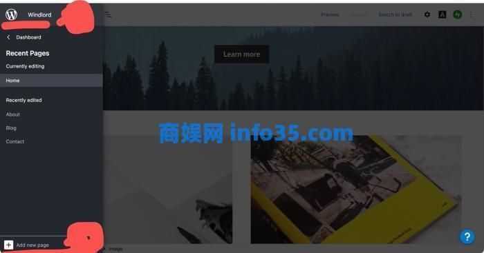建设新的页面时,从屏幕的左上角选择带有“W”字样的WordPress的logo。随后在左下角点击“Add new page”,增加一个新页面。