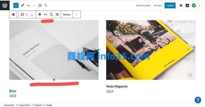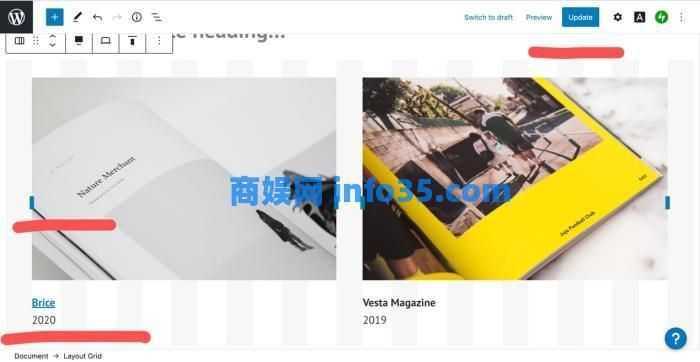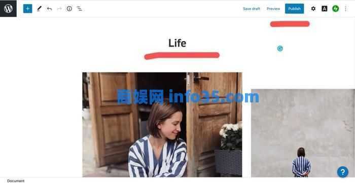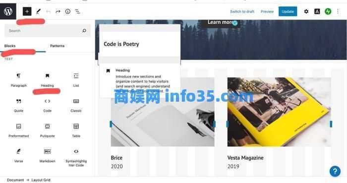 我选择了最简单的。点击左上角的“+”号,在Blocks里选择“Heading”,并且不曾输入文字。结果则会如下图一般,Heading自动将主题图片与相册分开。