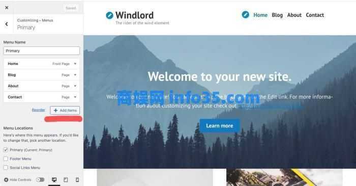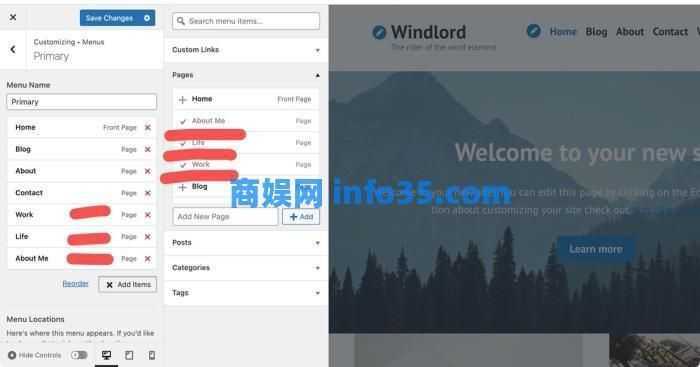 右侧会出现 Pages,里面就是主题自己带的,以及刚刚建好的所有页面。把新建的三个添加即可,它们会出现在左侧菜单栏里。
