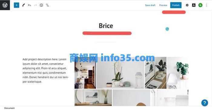 这个新页面我选择了Gallery里面的一个模板,图片将呈现平铺形式,并且左侧会有一些关于这个相册的简介。