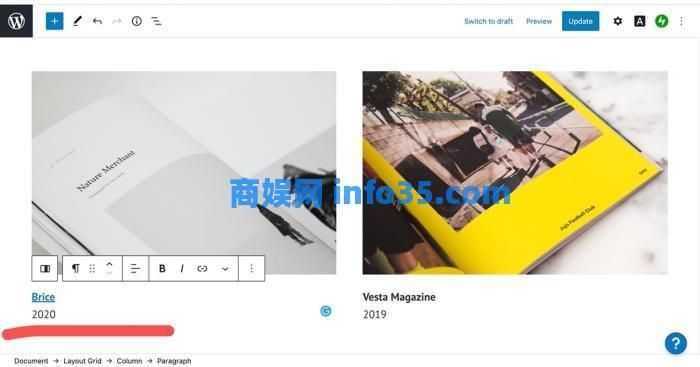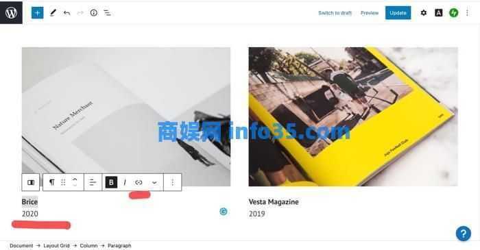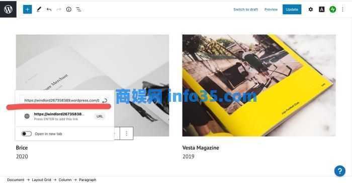 此时,“Brice”颜色自动改变,下方有横线,已经成功添加了新键的网页链接。点击右上角“Update”后,用个人网址进入自己的网站,点击“Brice”即可跳转(编辑页面及预览页面基本无法跳转)。