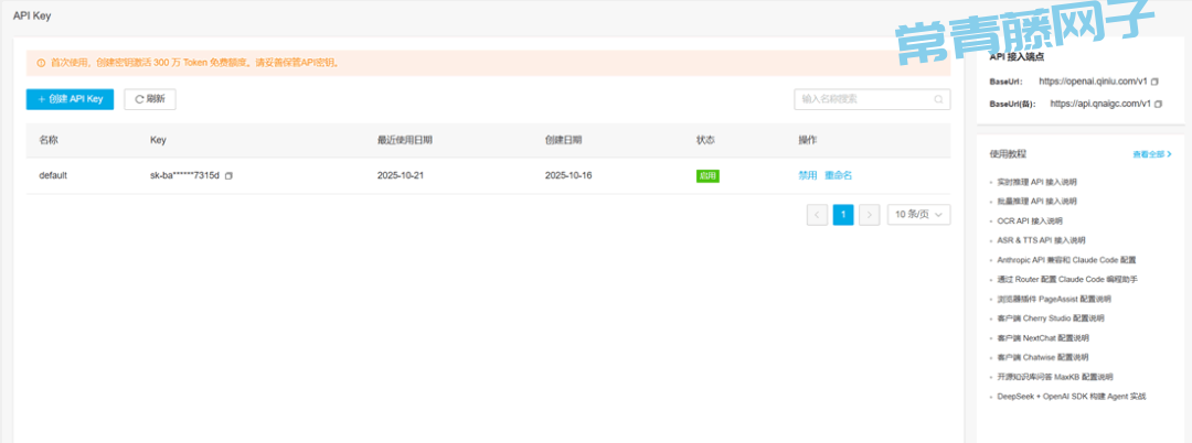 下图是我在七牛云后台接入的配置,该方案的核心在于,七牛云的AI推理服务提供了完全兼容OpenAI的API接口。这意味着,你可以直接从七牛云后台获取专属的API密钥与接口地址,然后将它们填入网上众多基于OpenAI标准开发的开源平台或应用中。通过这种无缝替换,你就能轻松构建属于自己的AI功能,享受七牛云聚合的多种模型与高性价比服务带来的便利。