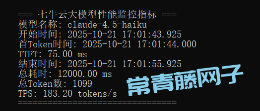 光能用还不行,还得好用。最重要的是不能“卡”。实测下来,像七牛云里claude-4.5-haiku这样的模型,TTFT(大概就是从你点击发送,到屏幕上蹦出第一个字的延时)只有75毫秒,生成速率也非常快,TPS 达到了183.2 tokens/s,差不多相当于每秒输出150-200个汉字,体验非常流畅。