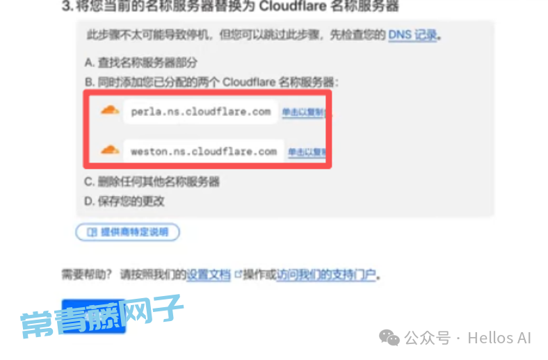进入到新的页面,往下拉找到下图红框标注的这两个DNS名称服务器,点击名称服务器后面的“单击以复制”复制这个服务器