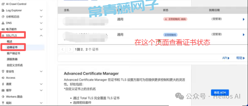 点击cloudflare左侧菜单栏的“SSL/TLS”->"边缘证书"