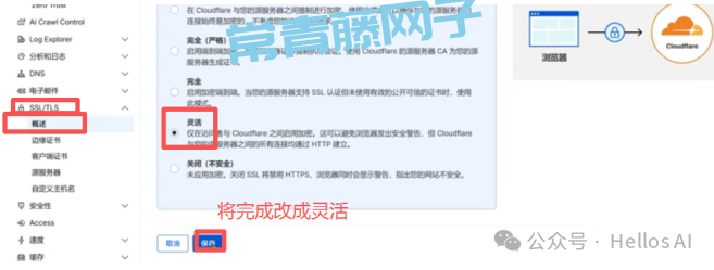 点击cloudflare左侧菜单栏的“SSL/TLS”->概述,往下翻,将“完全”改为“灵活”,然后点击“保存”。