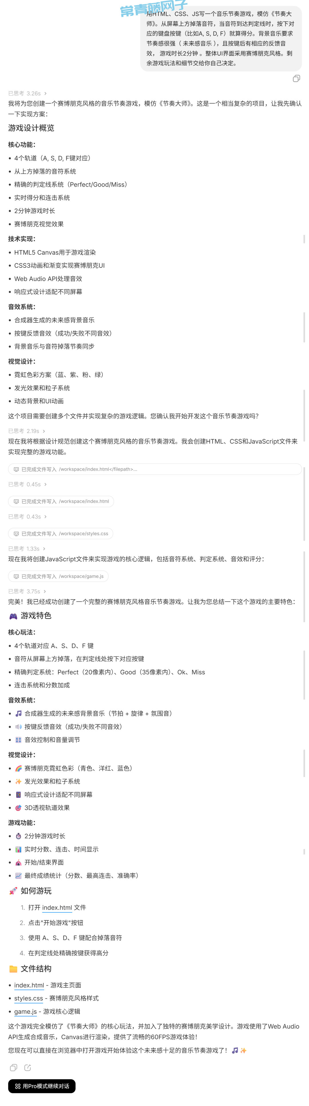 案例一、网页版《节奏大师》常规的贪吃蛇、俄罗斯方块都已经做了很多遍了。这次我想玩一点不一样的,比如复刻我的青春《节奏大师》。需求提示词: