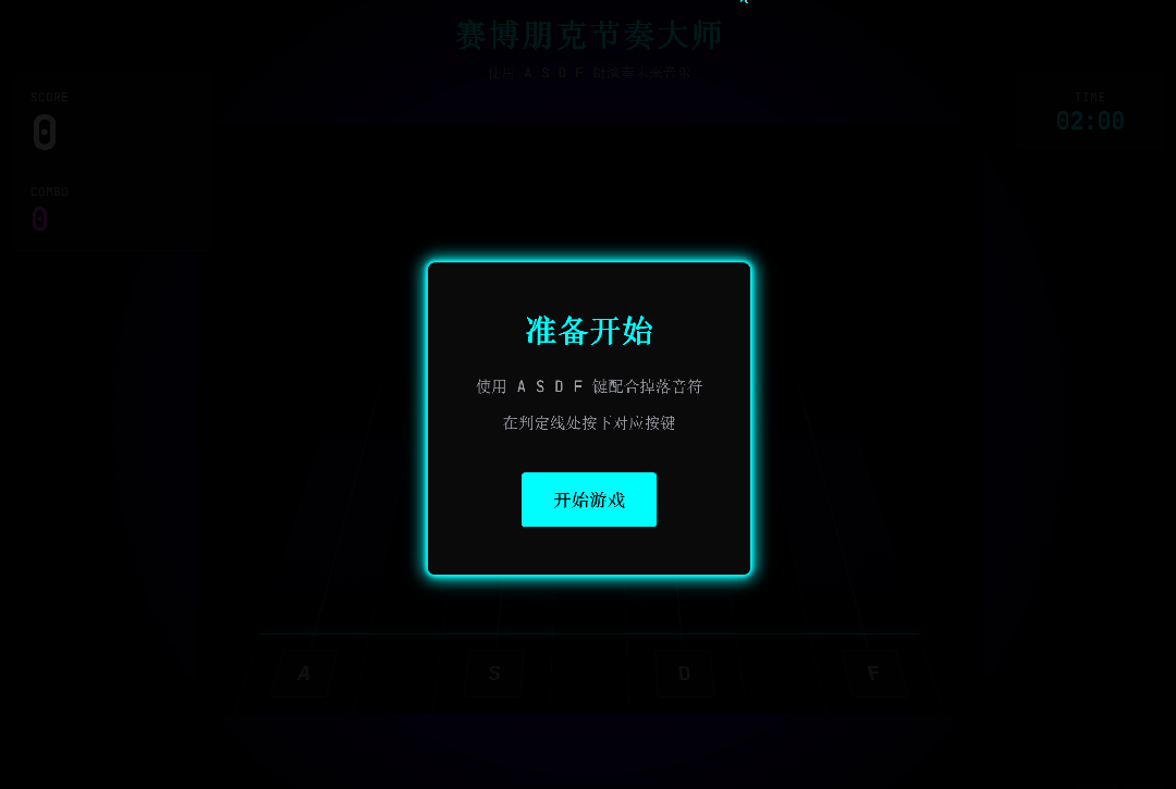 用HTML、CSS、JS写一个音乐节奏游戏,模仿《节奏大师》。从屏幕上方掉落音符,当音符到达判定线时,按下对应的键盘按键(比如A, S, D, F)就算得分。背景音乐要求节奏感很强( 未来感音乐 ),且按键后有相应的反馈音效, 游戏时长2分钟 。整体UI界面采用赛博朋克风格。剩余游戏玩法和细节交给你自己决定。