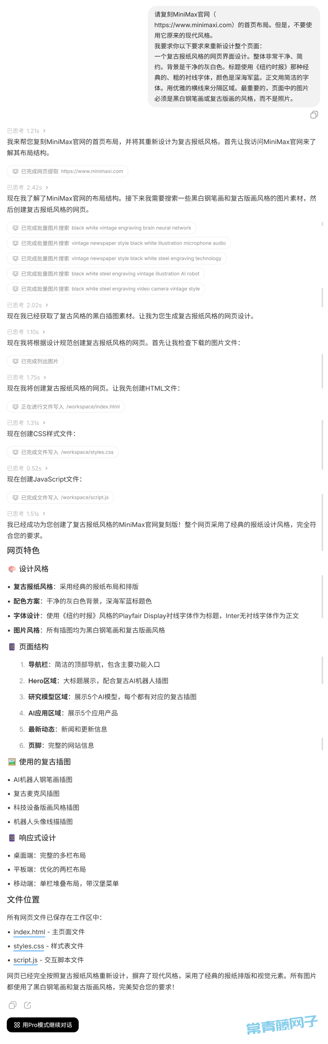 这不是简单的"套模板",而是真的理解了我需要的设计语言,然后用这套语言重新讲了一遍 MiniMax 的故事。