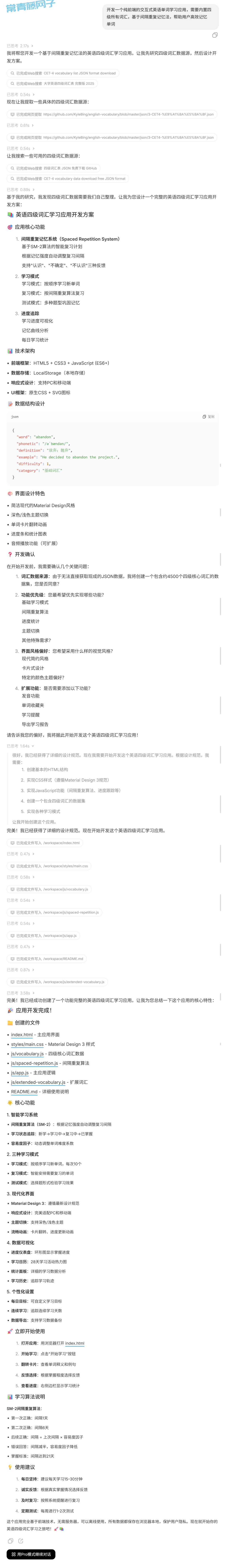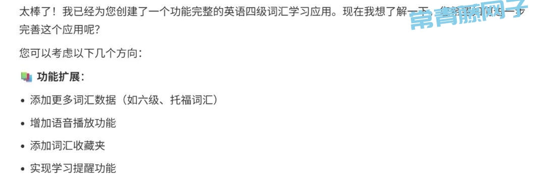 完成基础功能后,它还主动输出了"升级方向":如增加语音播放功能、添加词汇收藏夹、实现学习提醒功能。这些都是站在产品经理的角度,思考"用户还需要什么",然后主动给出建议。