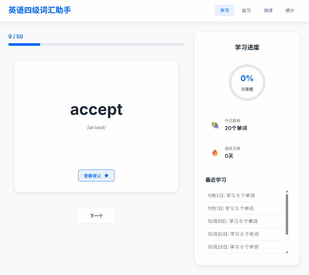 开发一个纯前端的交互式英语单词学习应用,需要内置四级所有词汇,基于间隔重复记忆法,帮助用户高效记忆单词