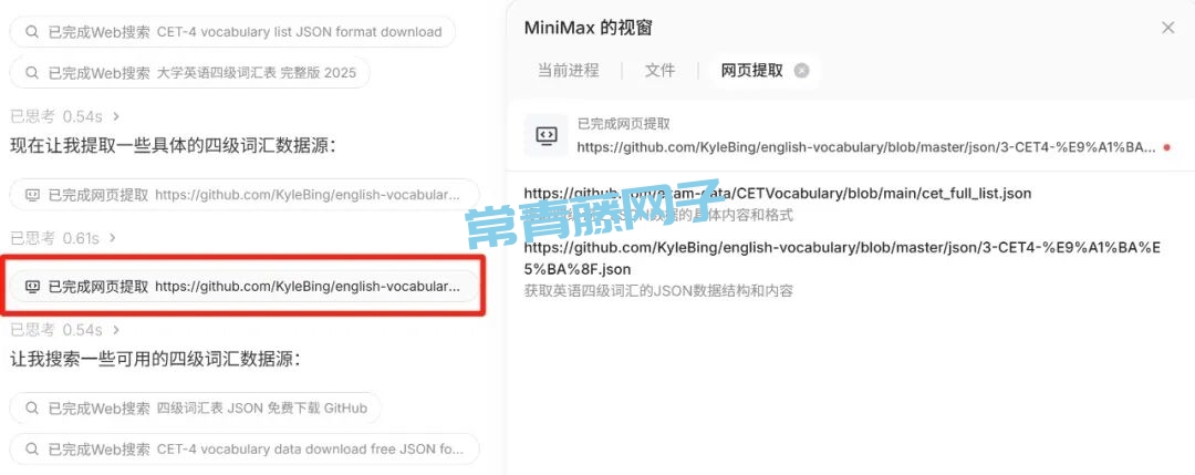 但 M2 的思考日志显示:它直接去 GitHub 找到了开源的四级词库,并完成了数据采集。
