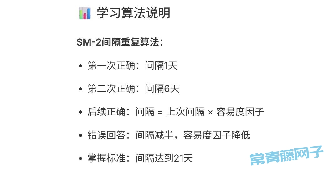 我说的是"间隔重复记忆法",这是一个很宽泛的概念。它给出的方案是:基于 SM-2 算法的智能复习计划。这说明它知道业界最成熟的算法是什么,并且直接实现了。