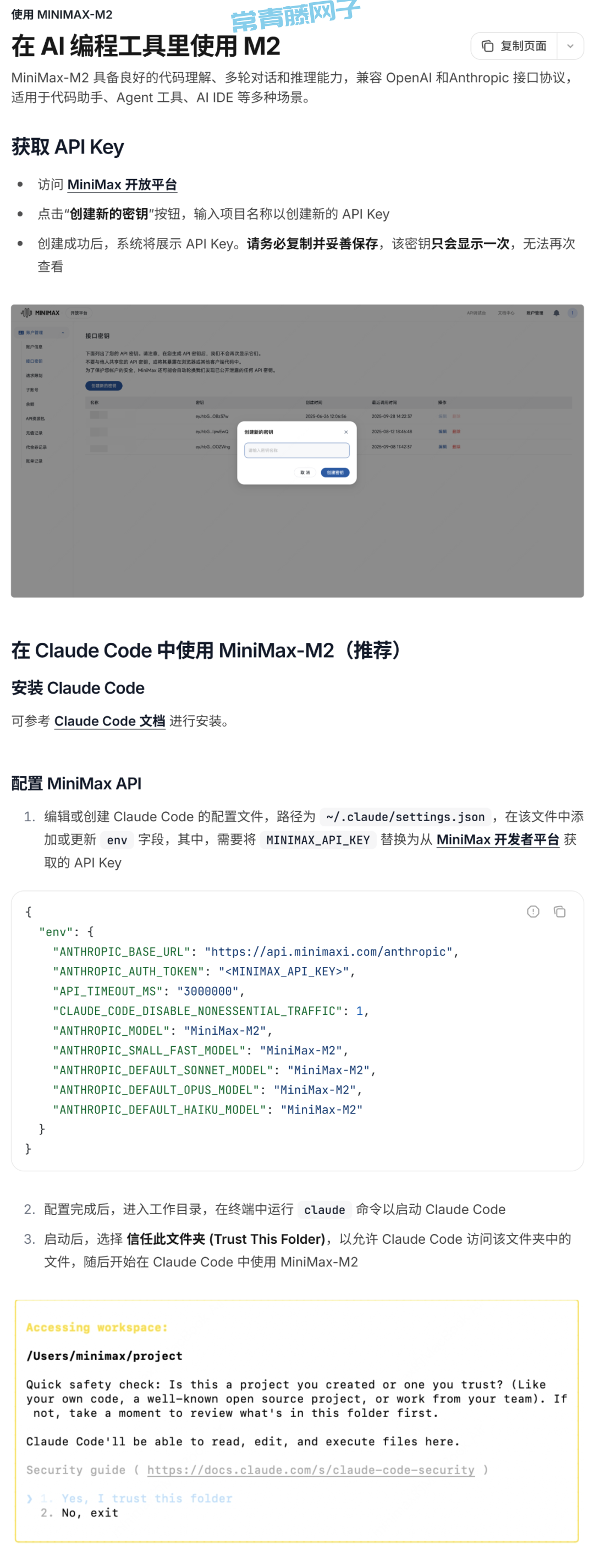 体验地址:https://agent.minimaxi.com当然如果你想在 AI Coding 工具中使用 M2,那就需要去 MiniMax 开放平台免费申请 API Key。本来想给大家演示下在如何 Claude Code 中使用 MiniMax-M2,但官方已经给出了非常完整教程 👇