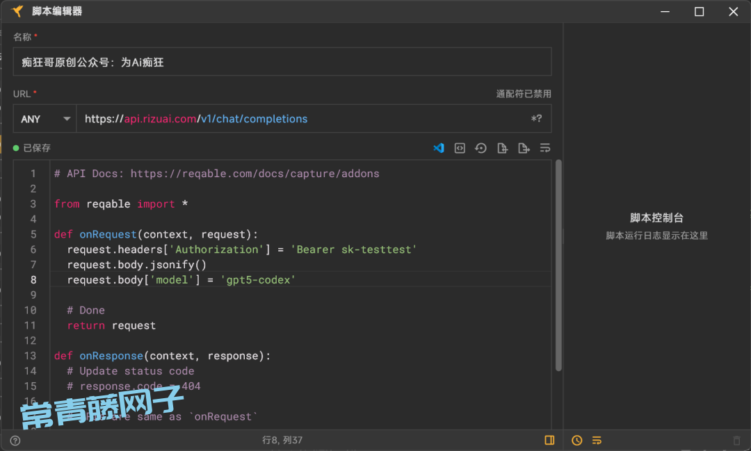 接下来,继续右键我们的这个接口,选择【脚本】我们需要简单编写脚本,继续修改请求的数据头(替换API KEY)和数据内容(替换模型id)