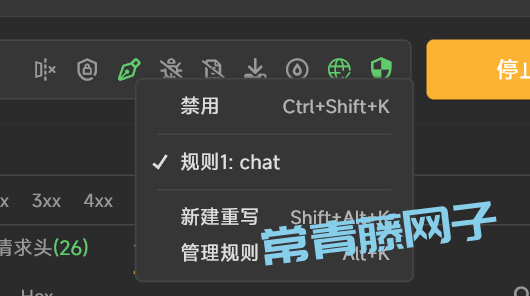 好的,我们关闭编辑窗口,打开Reqable的【重写】按钮,并启用我们刚刚添加的规则。