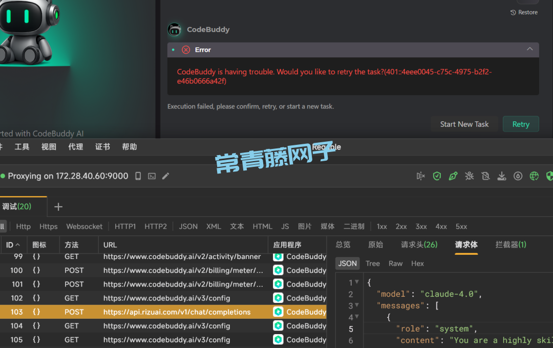 继续在CodeBuddy里发送消息,会发现报错了,这是正常的,我们在Reqable里查看到,已经成功请求我们的大模型接口了。