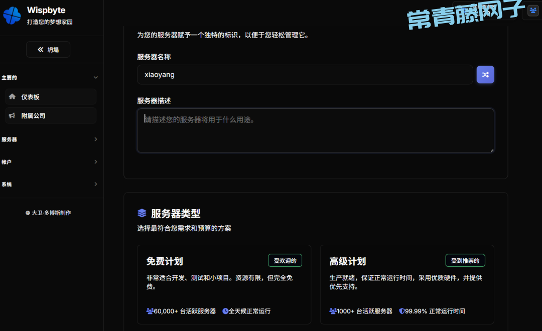 4.输入服务器名称,服务器描述可以留空,免费计划