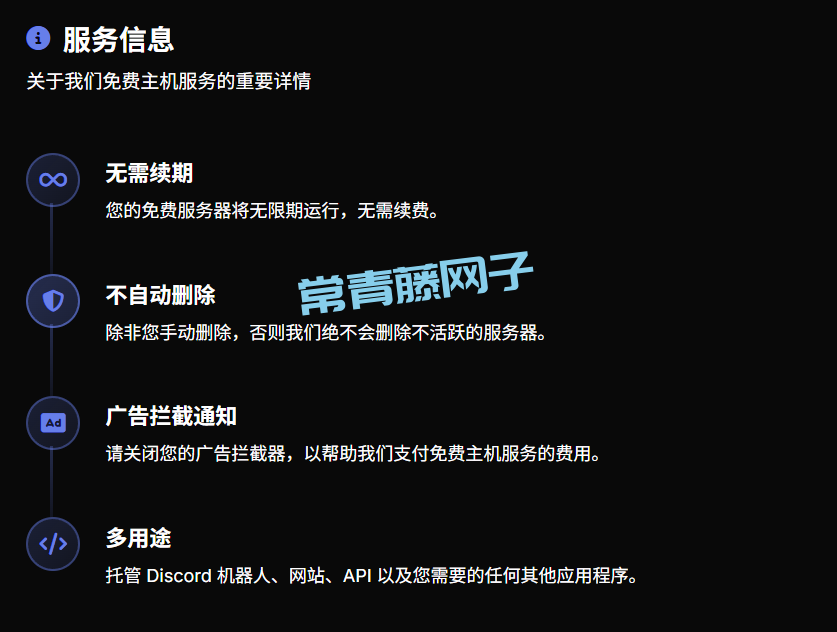 免费服务器会一直运行,不需要定期续费或手动续期。除非用户主动删除,否则不会因为长时间未使用而被系统清除。可以托管 Discord 机器人、网站、API,以及其他自定义应用程序。