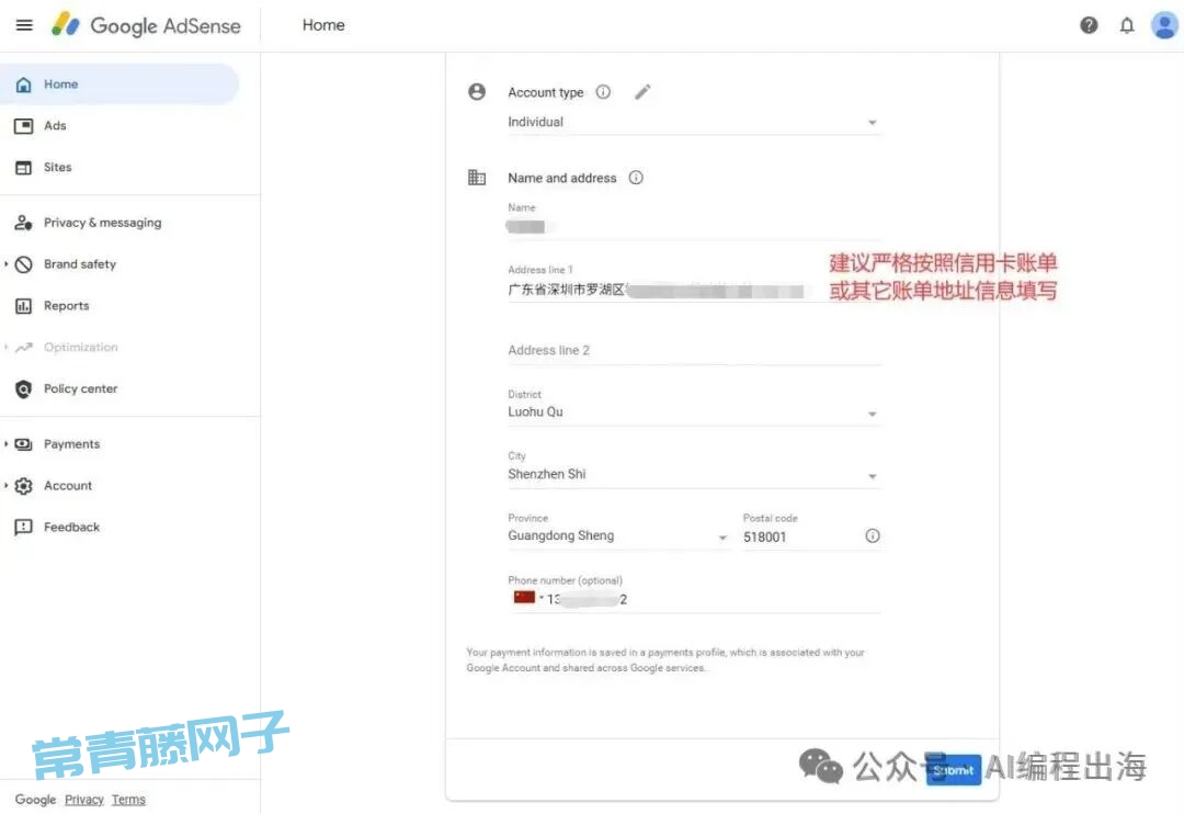 首先,“What type of account is Zheng Xitao”一般选择“Individual”,表示AdSense 账户是个人名义注册和运营;