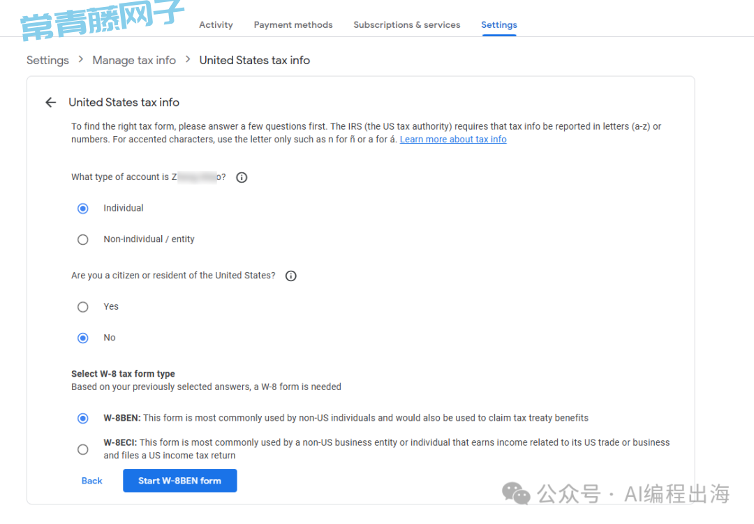 按照Adsense登录后的首页中的提示,进入VAT填写页面,进行“AdSense W-8BEN税务信息表格”填写: