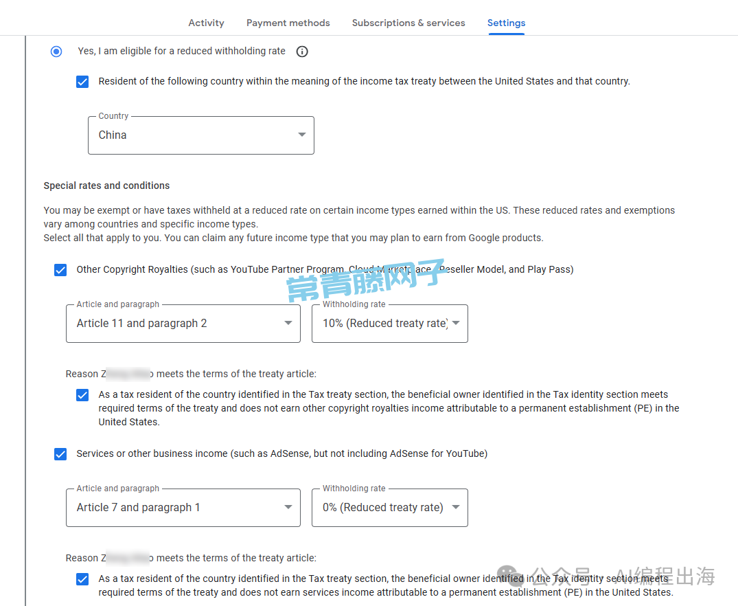“Other Copyright Royalties”建议勾选,YouTube收入属于版权(Copyright Royalties),即使你目前没有YouTube收入,也应勾选此项,以便未来YouTube获得收入时能享受税收协定优惠。勾选后,选择“Article 11 and paragraph 2”和“10% (Reduced treaty rate)”,表示根据中美协定,版权收入的最高预扣税率为10%,这远低于另一个选项。