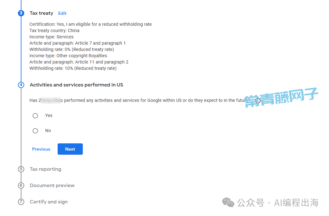 这是决定您的 AdSense 收入预扣税率的关键步骤。由于中国和美国之间签有税收协定,您可以据此申请较低的预扣税率,从而减少Google对你美国来源收入的扣税。