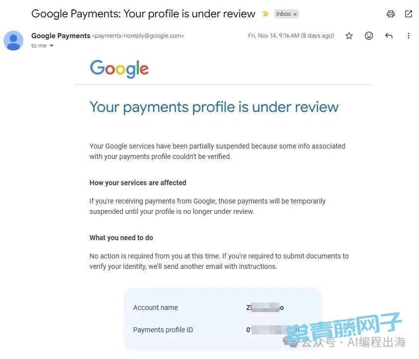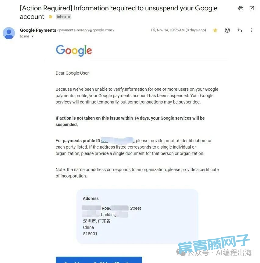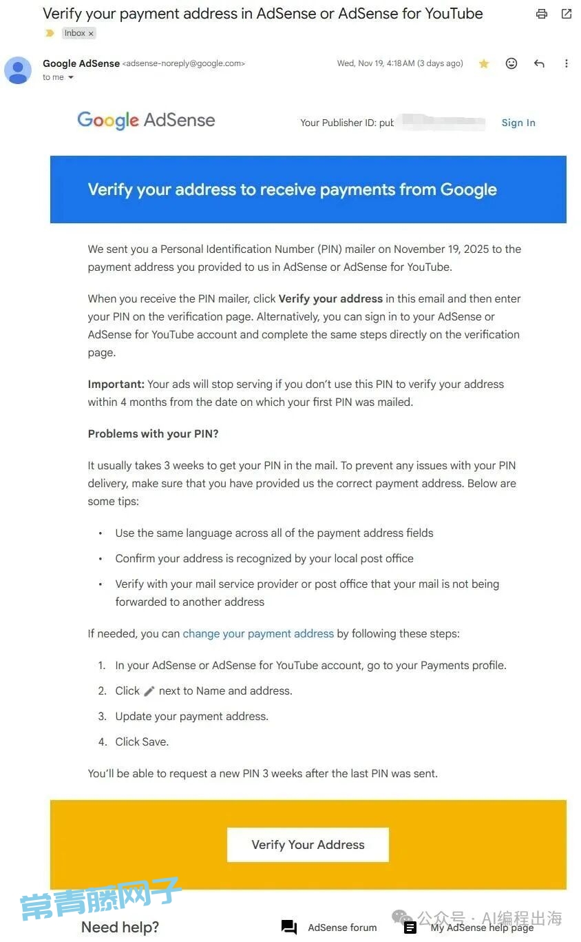 为了确保用户信息真实和账户安全,谷歌在向你发放Adsense收益之前,会要求你先验证收款地址。在填写完税务信息,我收到谷歌的邮件提醒:
