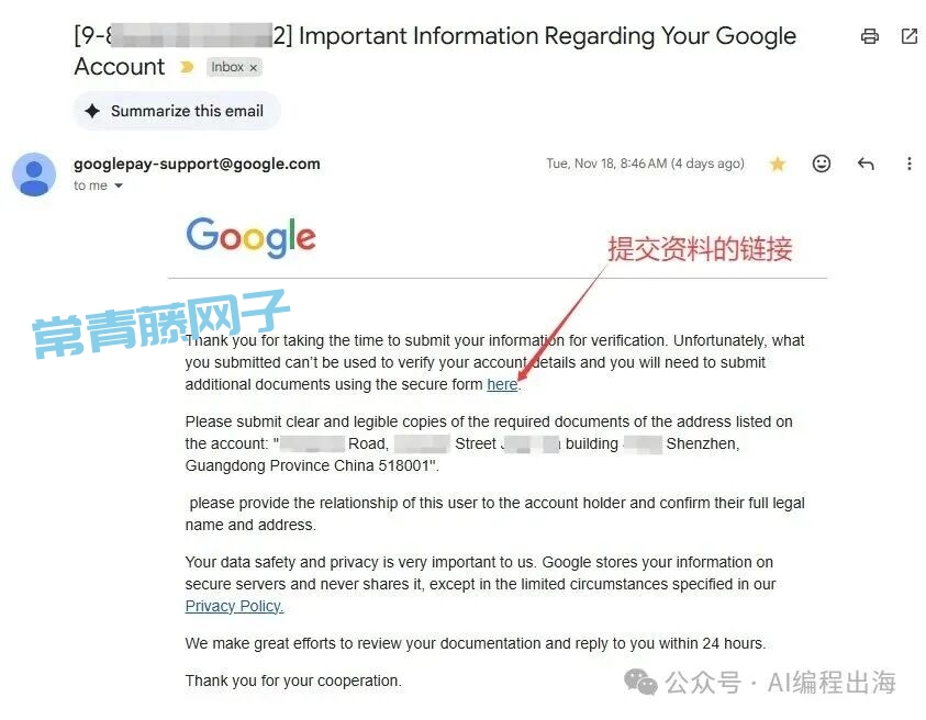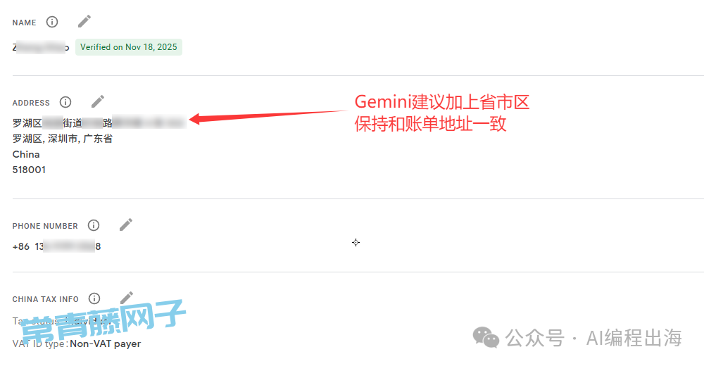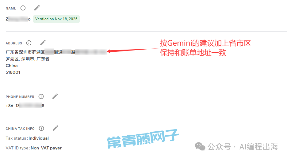 要求我重新提交证件信息和地址证明文件。这一次,我谨慎了一些,把谷歌发过来的邮件信息和我提交的资料一并发给Gemini,最后沟通发现可能存在这两个问题:一个是招行的信用卡账单中有中文的省市区信息:“广东省深圳市罗湖区”,而我在Adsense中填写的个人信息中的地址行没有涵盖“广东省深圳市罗湖区”,而后面下拉选择出来的省市区是英文,造成系统匹配地址行的时候信息不一致;