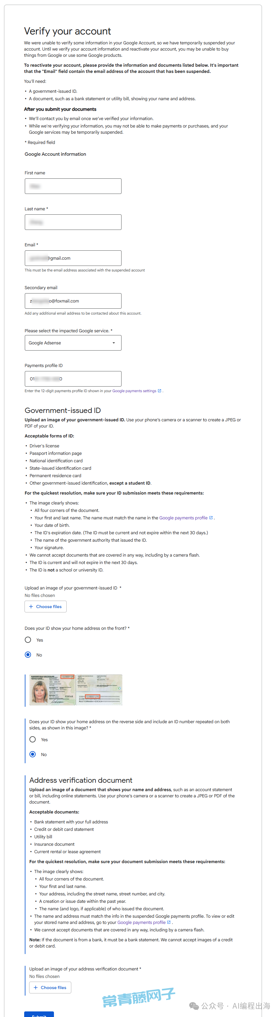 于是,我按照Gemini的建议重新修改了Adsense中的地址信息和税务信息,然后按邮件中提供的链接重新提交护照和信用卡账单: