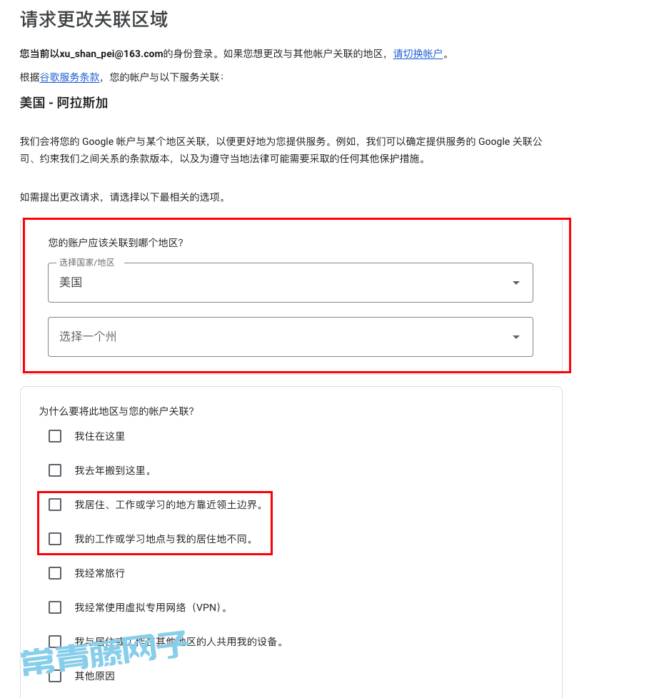 浏览器打开:https://policies.google.com/country-association-form,检查账号关联地区是否是美国
