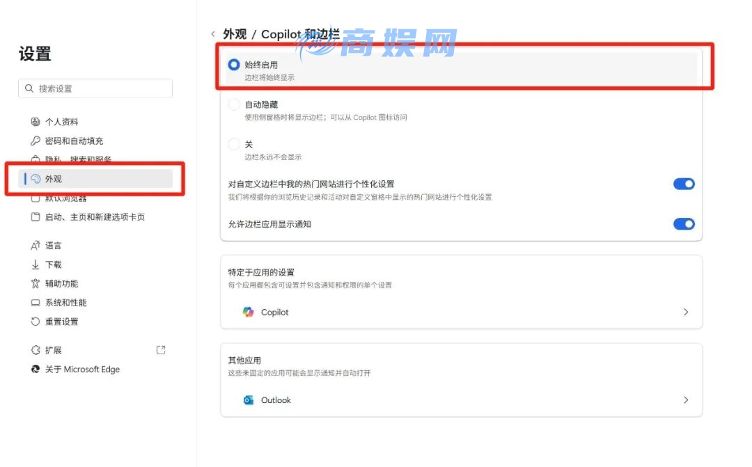 在 Edge 设置-外观中始终启用Copilot和边栏。