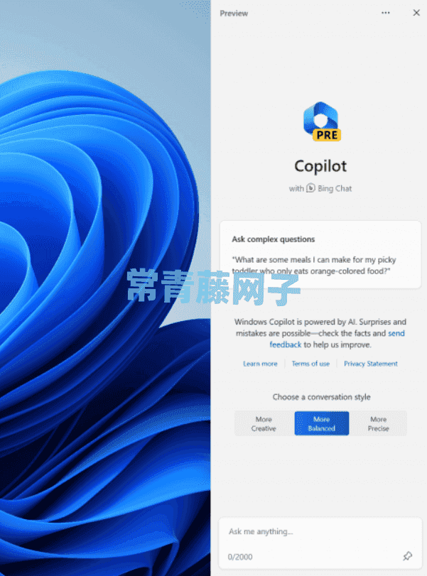 点击图标后,会在桌面右侧弹出一个窗口,它不会和桌面上的其他窗口重合。可以看到它目前集成了Bing Chat的功能,除此之外还可以给他一个命令,让它对系统进行各种操作(比如切换到黑暗模式、截图)等。