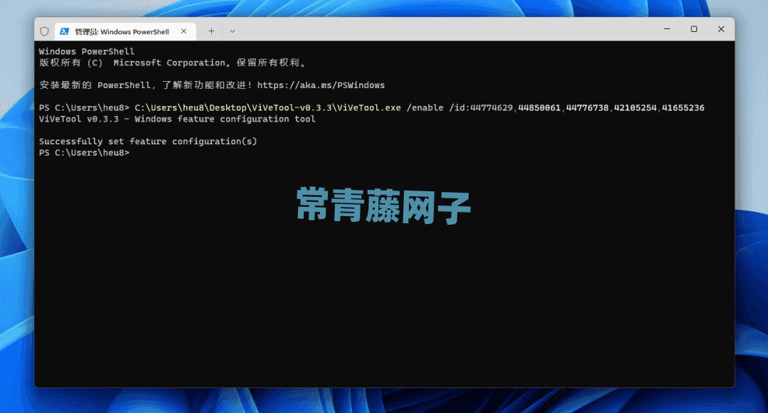 1.启用隐藏功能,可以使用ViVeTool工具(文末下载)。以管理身份运行如下命令。