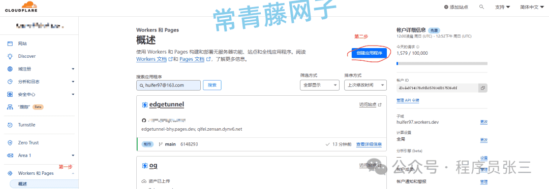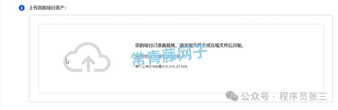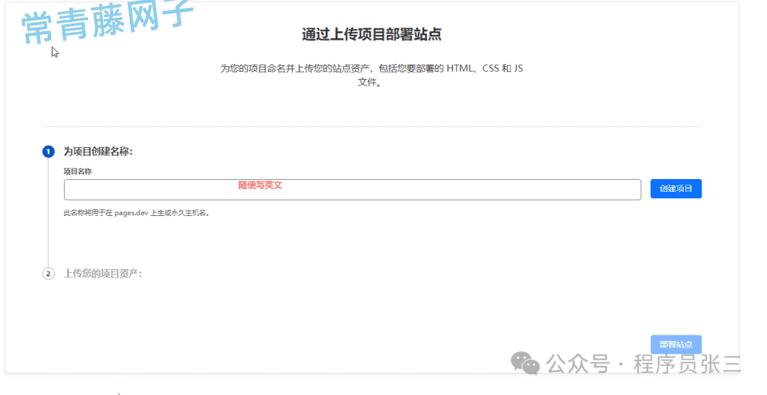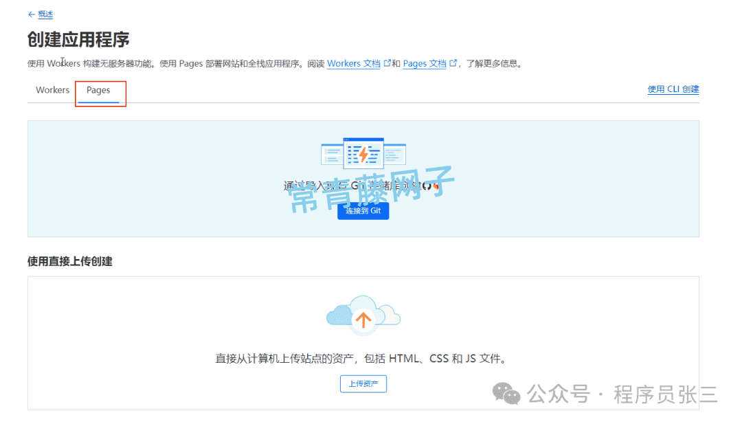 点击创建应用程序后,您将进入下面的界面。在这里,点击“Pages”并选择第二个选项,然后您可以上传您的资产。资产内容可以通过关注微信公众号:程序员张三,回复【cloudflare 】
