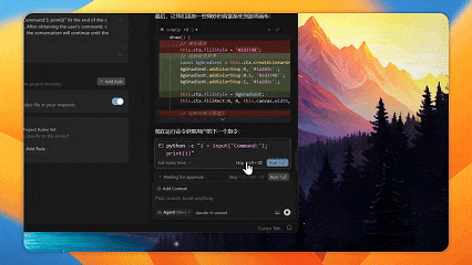 然后我们使用的这条规则,大概意思就是让Cursor在每次对话结束前调用一个Python命令来接收用户指令,接收到用户指令后完成用户的指令,直到用户说结束再结束本轮对话。